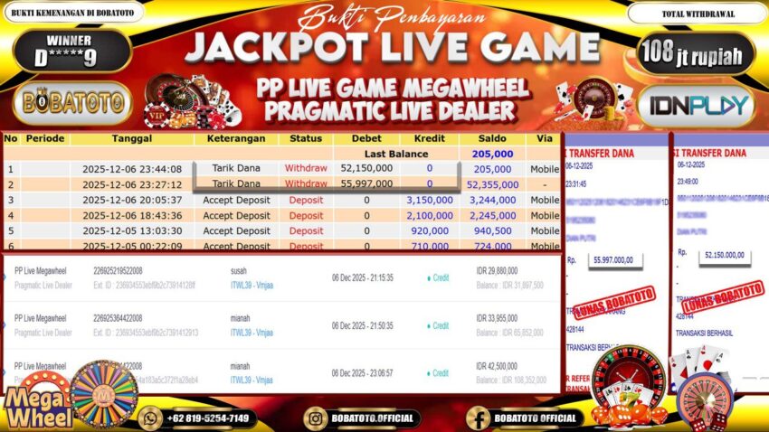 BOBATOTO – Selamat kepada User id : D*****9 Telah berhasil mendapatkan kemenangan besar pada permainan LIVE GAME MEGAWHEEL Dengan kemenangan Sebesar Rp.108,000,000,-. Setelah mengisi formulir withdraw dengan kurung waktu hanya 5 – 10 menit pihak bobatoto sudah melakukan transfer kepada pemilik Userid dan dana sudah dapat di cairkan oleh pemenang. Bukti pembayaran yang kami berikan merupakan bukti pembayaran yang SAH / VALID yang langung di dapatkan melaui tanda transfer transaksi dari Bank yang di tuju.