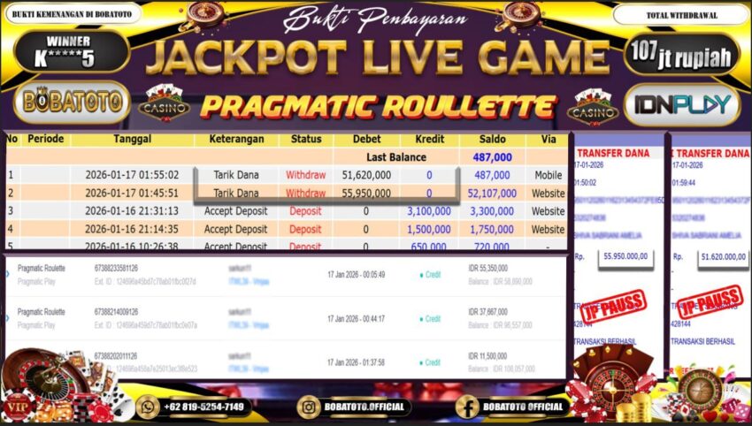 BOBATOTO – Selamat kepada User id : K*****5 Telah berhasil mendapatkan kemenangan besar pada permainan JACKPOT LIVE GAME PRAGMATIC ROULETTE Dengan kemenangan Sebesar Rp.107,000,000,-. Setelah mengisi formulir withdraw dengan kurung waktu hanya 5 – 10 menit pihak bobatoto sudah melakukan transfer kepada pemilik Userid dan dana sudah dapat di cairkan oleh pemenang. Bukti pembayaran yang kami berikan merupakan bukti pembayaran yang SAH / VALID yang langung di dapatkan melaui tanda transfer transaksi dari Bank yang di tuju.