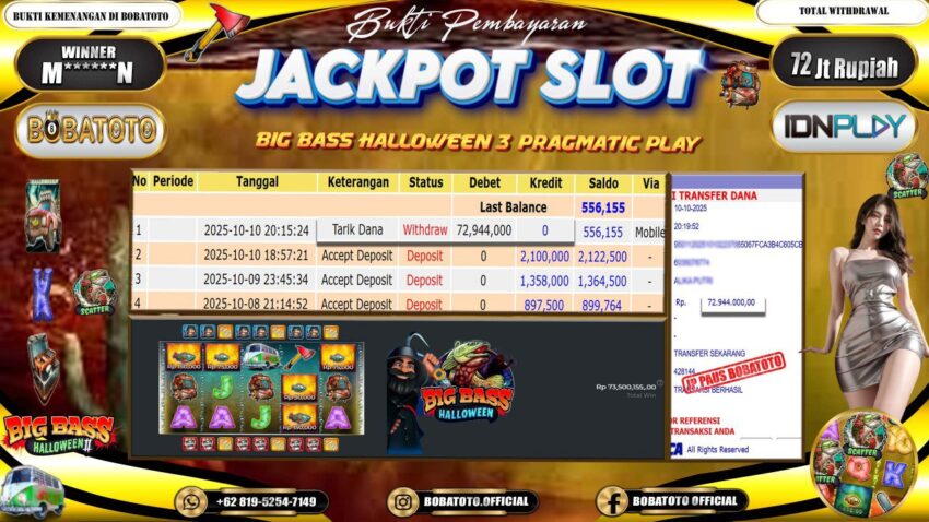 BOBATOTO – Selamat kepada User id : M******N Telah berhasil mendapatkan kemenangan besar pada permainan SLOT BIG BASS HALLOWEEN 3 Dengan kemenangan Sebesar Rp.72,000,000,-. Setelah mengisi formulir withdraw dengan kurung waktu hanya 5 – 10 menit pihak bobatoto sudah melakukan transfer kepada pemilik Userid dan dana sudah dapat di cairkan oleh pemenang. Bukti pembayaran yang kami berikan merupakan bukti pembayaran yang SAH / VALID yang langung di dapatkan melaui tanda transfer transaksi dari Bank yang di tuju.
