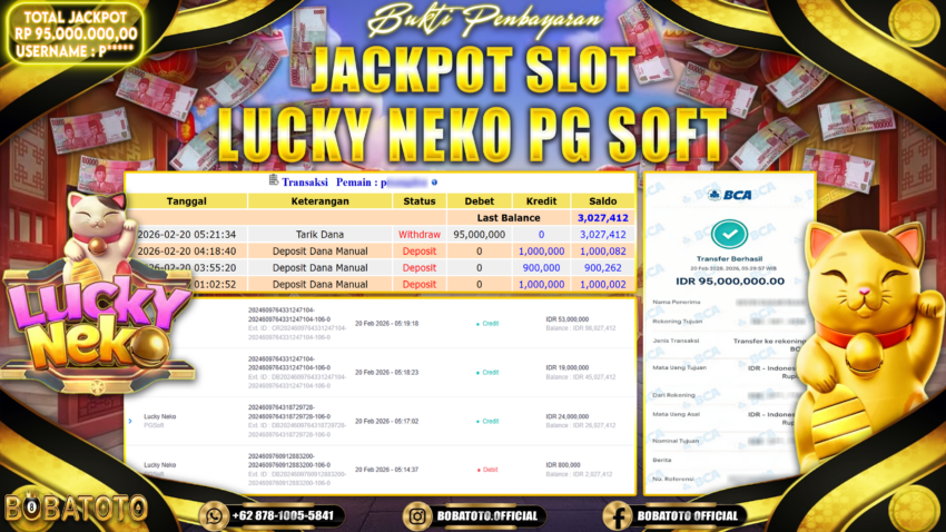 BOBATOTO – Selamat kepada User id : P***** Telah berhasil mendapatkan kemenangan besar pada permainan SLOT LUCKY NEKO Dengan kemenangan Sebesar Rp.95,000,000,-. Setelah mengisi formulir withdraw dengan kurung waktu hanya 5 – 10 menit pihak bobatoto sudah melakukan transfer kepada pemilik Userid dan dana sudah dapat di cairkan oleh pemenang. Bukti pembayaran yang kami berikan merupakan bukti pembayaran yang SAH / VALID yang langung di dapatkan melaui tanda transfer transaksi dari Bank yang di tuju.