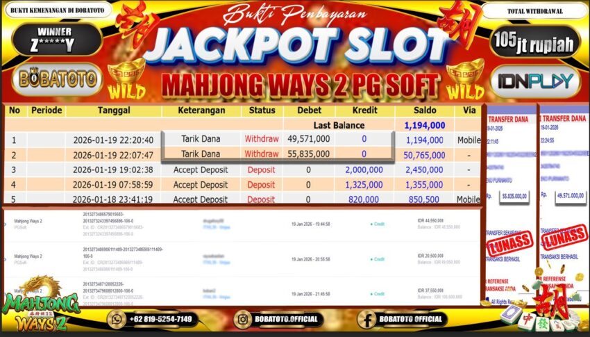 BOBATOTO – Selamat kepada User id :Z*****Y Telah berhasil mendapatkan kemenangan besar pada permainan SLOT MAHJONG WINS-2 Dengan kemenangan Sebesar Rp.105,000,000-. Setelah mengisi formulir withdraw dengan kurung waktu hanya 5 – 10 menit pihak bobatoto sudah melakukan transfer kepada pemilik Userid dan dana sudah dapat di cairkan oleh pemenang. Bukti pembayaran yang kami berikan merupakan bukti pembayaran yang SAH / VALID yang langung di dapatkan melaui tanda transfer transaksi dari Bank yang di tuju.