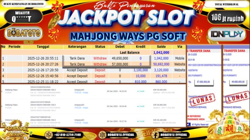 BOBATOTO – Selamat kepada User id :Q*****T Telah berhasil mendapatkan kemenangan besar pada permainan SLOT MAHJONG WAYS Dengan kemenangan Sebesar Rp.106,000,000-. Setelah mengisi formulir withdraw dengan kurung waktu hanya 5 – 10 menit pihak bobatoto sudah melakukan transfer kepada pemilik Userid dan dana sudah dapat di cairkan oleh pemenang. Bukti pembayaran yang kami berikan merupakan bukti pembayaran yang SAH / VALID yang langung di dapatkan melaui tanda transfer transaksi dari Bank yang di tuju.