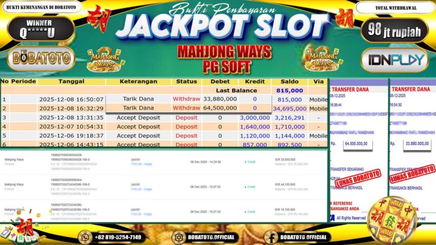BOBATOTO – Selamat kepada User id :Q*****U Telah berhasil mendapatkan kemenangan besar pada permainan SLOT MAHJONG WAYS Dengan kemenangan Sebesar Rp.98,000,000-. Setelah mengisi formulir withdraw dengan kurung waktu hanya 5 – 10 menit pihak bobatoto sudah melakukan transfer kepada pemilik Userid dan dana sudah dapat di cairkan oleh pemenang. Bukti pembayaran yang kami berikan merupakan bukti pembayaran yang SAH / VALID yang langung di dapatkan melaui tanda transfer transaksi dari Bank yang di tuju.