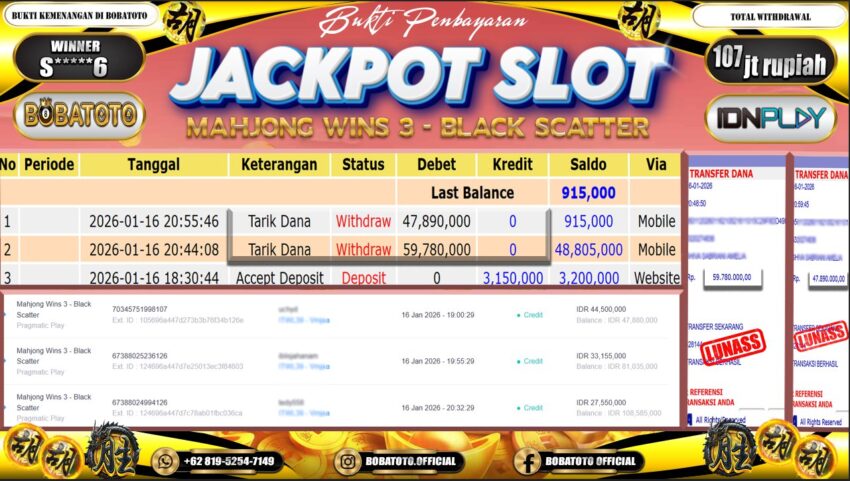 BOBATOTO – Selamat kepada User id : S*****6 Telah berhasil mendapatkan kemenangan besar pada permainan SLOT MAHJONG WINS-3 BLACK SCATTER Dengan kemenangan Sebesar Rp.107,000,000-. Setelah mengisi formulir withdraw dengan kurung waktu hanya 5 – 10 menit pihak bobatoto sudah melakukan transfer kepada pemilik Userid dan dana sudah dapat di cairkan oleh pemenang. Bukti pembayaran yang kami berikan merupakan bukti pembayaran yang SAH / VALID yang langung di dapatkan melaui tanda transfer transaksi dari Bank yang di tuju.