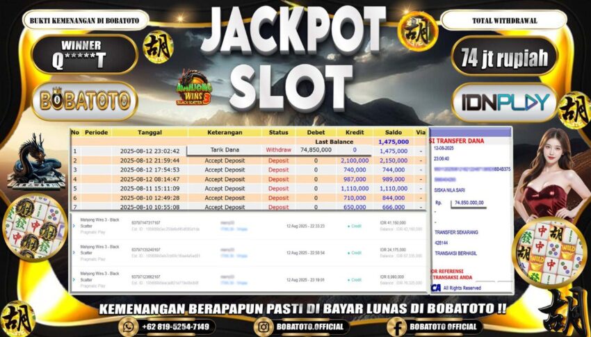 BOBATOTO – Selamat kepada User id :Q*****T Telah berhasil mendapatkan kemenangan besar pada permainan  SLOT MAHJONG WINS-3 BLACK SCATTER Dengan kemenangan Sebesar Rp.74,000,000-. Setelah mengisi formulir withdraw dengan kurung waktu hanya 5 – 10 menit pihak bobatoto sudah melakukan transfer kepada pemilik Userid dan dana sudah dapat di cairkan oleh pemenang. Bukti pembayaran yang kami berikan merupakan bukti pembayaran yang SAH / VALID yang langung di dapatkan melaui tanda transfer transaksi dari Bank yang di tuju.