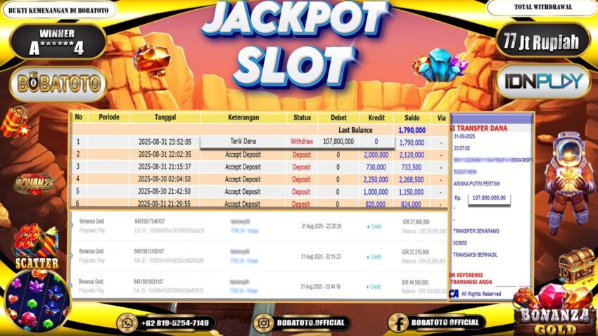 BOBATOTO – Selamat kepada User id : A******4 Telah berhasil mendapatkan kemenangan besar pada permainan  SLOT PRAGMATIC BONANZA GOLD  Dengan kemenangan Sebesar Rp.77,000,000,-. Setelah mengisi formulir withdraw dengan kurung waktu hanya 5 – 10 menit pihak bobatoto sudah melakukan transfer kepada pemilik Userid dan dana sudah dapat di cairkan oleh pemenang. Bukti pembayaran yang kami berikan merupakan bukti pembayaran yang SAH / VALID yang langung di dapatkan melaui tanda transfer transaksi dari Bank yang di tuju.
