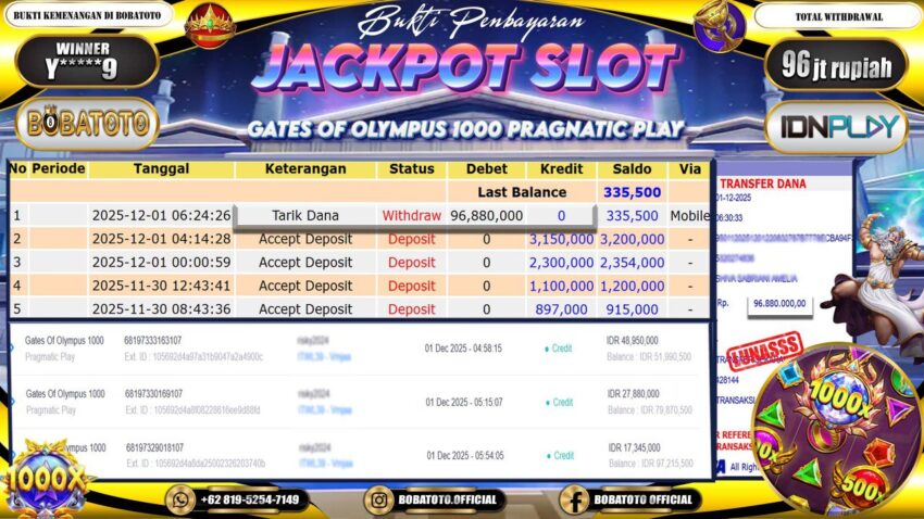BOBATOTO – Selamat kepada User id : Y*****9 Telah berhasil mendapatkan kemenangan besar pada permainan SLOT PRAGMATIC GATES OF OLYMPUS 1000 Dengan kemenangan Sebesar Rp.96,000,000,-. Setelah mengisi formulir withdraw dengan kurung waktu hanya 5 – 10 menit pihak bobatoto sudah melakukan transfer kepada pemilik Userid dan dana sudah dapat di cairkan oleh pemenang. Bukti pembayaran yang kami berikan merupakan bukti pembayaran yang SAH / VALID yang langung di dapatkan melaui tanda transfer transaksi dari Bank yang di tuju.