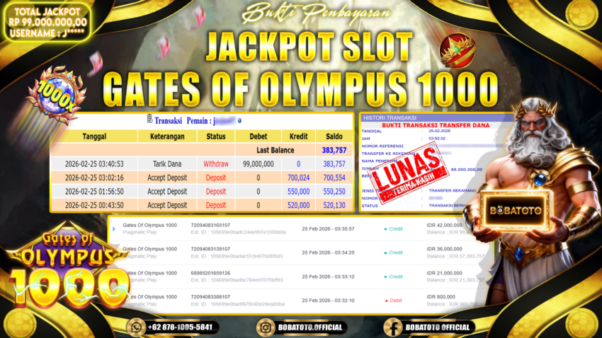 BOBATOTO – Selamat kepada User id : J***** Telah berhasil mendapatkan kemenangan besar pada permainan SLOT PRAGMATIC GATES OF OLYMPUS 1000 Dengan kemenangan Sebesar Rp.99,000,000,-. Setelah mengisi formulir withdraw dengan kurung waktu hanya 5 – 10 menit pihak bobatoto sudah melakukan transfer kepada pemilik Userid dan dana sudah dapat di cairkan oleh pemenang. Bukti pembayaran yang kami berikan merupakan bukti pembayaran yang SAH / VALID yang langung di dapatkan melaui tanda transfer transaksi dari Bank yang di tuju.