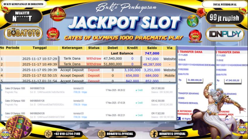 BOBATOTO – Selamat kepada User id : N*****T Telah berhasil mendapatkan kemenangan besar pada permainan  SLOT PRAGMATIC GATES OF OLYMPUS 1000  Dengan kemenangan Sebesar Rp.99,000,000,-. Setelah mengisi formulir withdraw dengan kurung waktu hanya 5 – 10 menit pihak bobatoto sudah melakukan transfer kepada pemilik Userid dan dana sudah dapat di cairkan oleh pemenang. Bukti pembayaran yang kami berikan merupakan bukti pembayaran yang SAH / VALID yang langung di dapatkan melaui tanda transfer transaksi dari Bank yang di tuju.