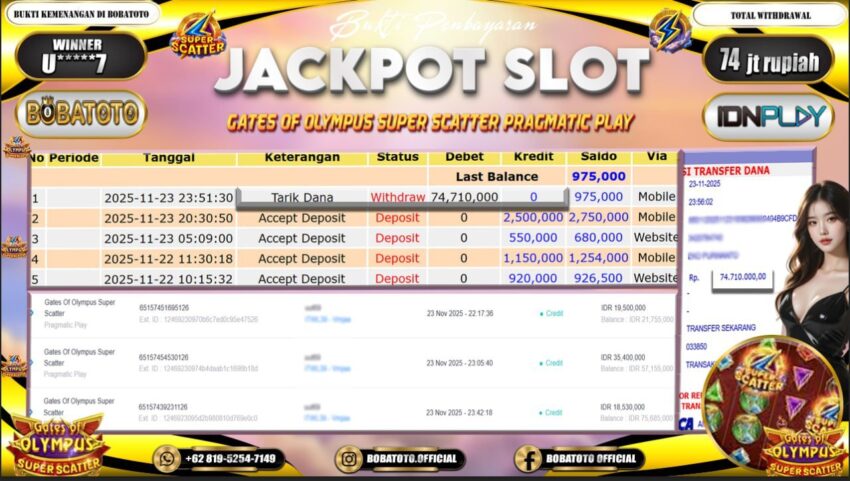 BOBATOTO – Selamat kepada User id : U*****7 Telah berhasil mendapatkan kemenangan besar pada permainan SLOT PRAGMATIC GATES OF OLYMPUS SUPER SCATTER Dengan kemenangan Sebesar Rp.74,000,000,-. Setelah mengisi formulir withdraw dengan kurung waktu hanya 5 – 10 menit pihak bobatoto sudah melakukan transfer kepada pemilik Userid dan dana sudah dapat di cairkan oleh pemenang. Bukti pembayaran yang kami berikan merupakan bukti pembayaran yang SAH / VALID yang langung di dapatkan melaui tanda transfer transaksi dari Bank yang di tuju.