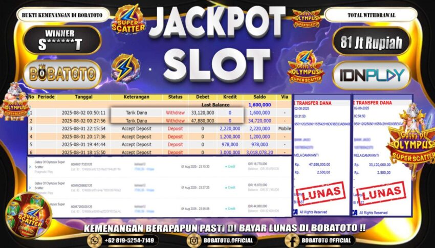 BOBATOTO – Selamat kepada User id : S******T Telah berhasil mendapatkan kemenangan besar pada permainan SLOT PRAGMATIC GATES OF OLYMPUS SUPER SCATTER Dengan kemenangan Sebesar Rp.81,000,000,-. Setelah mengisi formulir withdraw dengan kurung waktu hanya 5 – 10 menit pihak bobatoto sudah melakukan transfer kepada pemilik Userid dan dana sudah dapat di cairkan oleh pemenang. Bukti pembayaran yang kami berikan merupakan bukti pembayaran yang SAH / VALID yang langung di dapatkan melaui tanda transfer transaksi dari Bank yang di tuju.