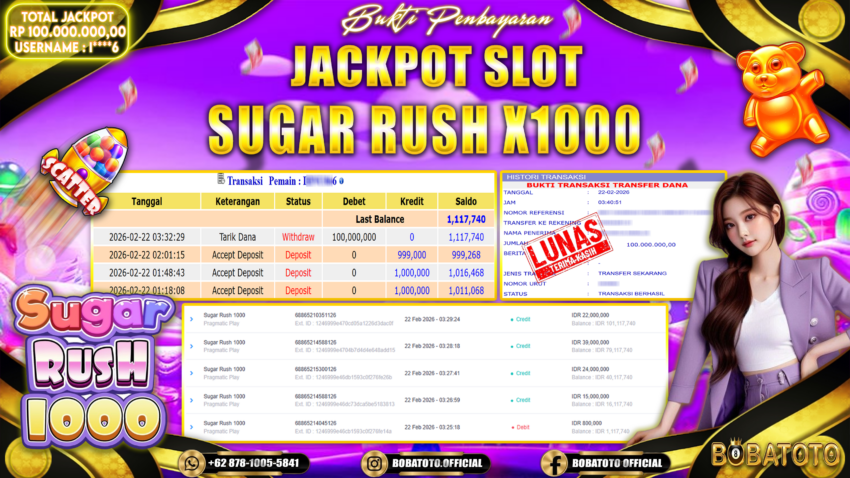 BOBATOTO – Selamat kepada User id : I*****6 Telah berhasil mendapatkan kemenangan besar pada permainan SLOT PRAGMATIC SUGAR RUSH Dengan kemenangan Sebesar Rp.100,000,000,-. Setelah mengisi formulir withdraw dengan kurung waktu hanya 5 – 10 menit pihak bobatoto sudah melakukan transfer kepada pemilik Userid dan dana sudah dapat di cairkan oleh pemenang. Bukti pembayaran yang kami berikan merupakan bukti pembayaran yang SAH / VALID yang langung di dapatkan melaui tanda transfer transaksi dari Bank yang di tuju.