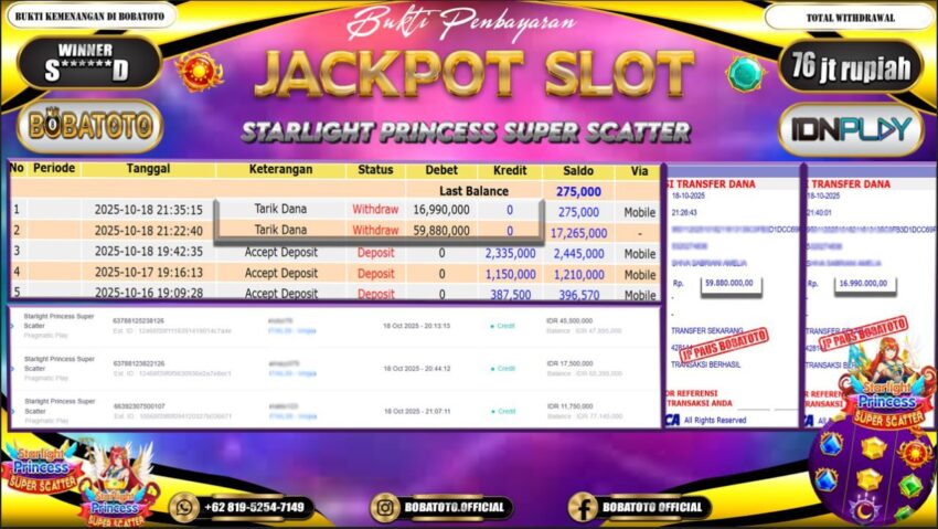 BOBATOTO – Selamat kepada User id : S*****D Telah berhasil mendapatkan kemenangan besar pada permainan  SLOT STARLIGHT PRINCES SUPER SCATTER  Dengan kemenangan Sebesar Rp.76,000,000,-. Setelah mengisi formulir withdraw dengan kurung waktu hanya 5 – 10 menit pihak bobatoto sudah melakukan transfer kepada pemilik Userid dan dana sudah dapat di cairkan oleh pemenang. Bukti pembayaran yang kami berikan merupakan bukti pembayaran yang SAH / VALID yang langung di dapatkan melaui tanda transfer transaksi dari Bank yang di tuju.