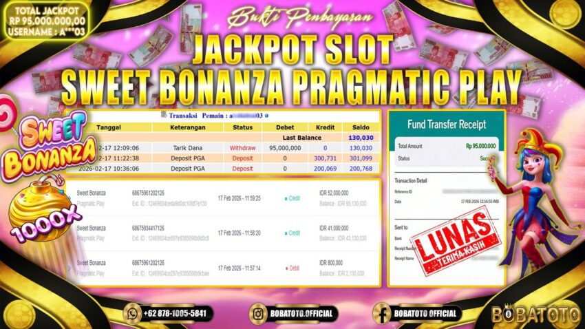 BOBATOTO – Selamat kepada User id : A***30 Telah berhasil mendapatkan kemenangan besar pada permainan SLOT SWEET BONANZA Dengan kemenangan Sebesar Rp.95,000,000,-. Setelah mengisi formulir withdraw dengan kurung waktu hanya 5 – 10 menit pihak bobatoto sudah melakukan transfer kepada pemilik Userid dan dana sudah dapat di cairkan oleh pemenang. Bukti pembayaran yang kami berikan merupakan bukti pembayaran yang SAH / VALID yang langung di dapatkan melaui tanda transfer transaksi dari Bank yang di tuju.