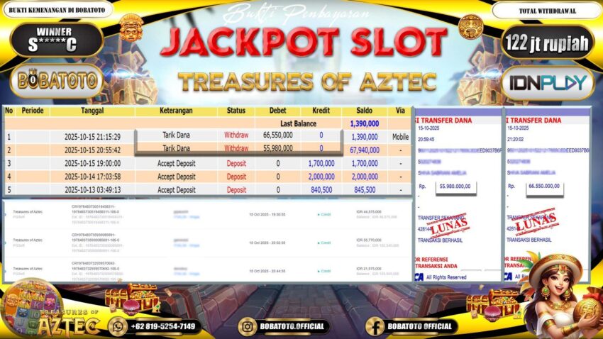 BOBATOTO – Selamat kepada User id : S*****C Telah berhasil mendapatkan kemenangan besar pada permainan  SLOT TREASURES OF AZTEC  Dengan kemenangan Sebesar Rp.122,000,000,-. Setelah mengisi formulir withdraw dengan kurung waktu hanya 5 – 10 menit pihak bobatoto sudah melakukan transfer kepada pemilik Userid dan dana sudah dapat di cairkan oleh pemenang. Bukti pembayaran yang kami berikan merupakan bukti pembayaran yang SAH / VALID yang langung di dapatkan melaui tanda transfer transaksi dari Bank yang di tuju.