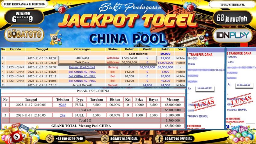 BOBATOTO – Selamat kepada User id : W*****T Telah berhasil mendapatkan kemenangan besar pada permainan TOGEL CHINA Dengan kemenangan Sebesar Rp.68,000,000,-. Setelah mengisi formulir withdraw dengan kurung waktu hanya 5 – 10 menit pihak bobatoto sudah melakukan transfer kepada pemilik Userid dan dana sudah dapat di cairkan oleh pemenang. Bukti pembayaran yang kami berikan merupakan bukti pembayaran yang SAH / VALID yang langung di dapatkan melaui tanda transfer transaksi dari Bank yang di tuju.