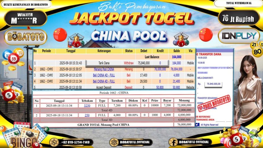 BOBATOTO – Selamat kepada User id : M******R Telah berhasil mendapatkan kemenangan besar pada permainan TOGEL CHINA Dengan kemenangan Sebesar Rp.76,000,000,-. Setelah mengisi formulir withdraw dengan kurung waktu hanya 5 – 10 menit pihak bobatoto sudah melakukan transfer kepada pemilik Userid dan dana sudah dapat di cairkan oleh pemenang. Bukti pembayaran yang kami berikan merupakan bukti pembayaran yang SAH / VALID yang langung di dapatkan melaui tanda transfer transaksi dari Bank yang di tuju.