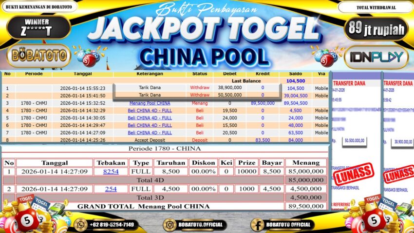 BOBATOTO – Selamat kepada User id : Z*****T Telah berhasil mendapatkan kemenangan besar pada permainan TOGEL CHINA Dengan kemenangan Sebesar Rp.89,000,000,-. Setelah mengisi formulir withdraw dengan kurung waktu hanya 5 – 10 menit pihak bobatoto sudah melakukan transfer kepada pemilik Userid dan dana sudah dapat di cairkan oleh pemenang. Bukti pembayaran yang kami berikan merupakan bukti pembayaran yang SAH / VALID yang langung di dapatkan melaui tanda transfer transaksi dari Bank yang di tuju.