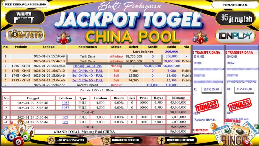 BOBATOTO – Selamat kepada User id : P*****T Telah berhasil mendapatkan kemenangan besar pada permainan TOGEL CHINA Dengan kemenangan Sebesar Rp.95,000,000,-. Setelah mengisi formulir withdraw dengan kurung waktu hanya 5 – 10 menit pihak bobatoto sudah melakukan transfer kepada pemilik Userid dan dana sudah dapat di cairkan oleh pemenang. Bukti pembayaran yang kami berikan merupakan bukti pembayaran yang SAH / VALID yang langung di dapatkan melaui tanda transfer transaksi dari Bank yang di tuju.