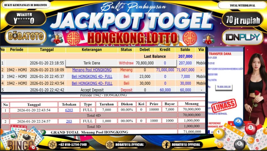 BOBATOTO – Selamat kepada User id : Y*****0 Telah berhasil mendapatkan kemenangan besar pada permainan TOGEL HONGKONG LOTTO Dengan kemenangan Sebesar Rp.70,000,000,-. Setelah mengisi formulir withdraw dengan kurung waktu hanya 5 – 10 menit pihak bobatoto sudah melakukan transfer kepada pemilik Userid dan dana sudah dapat di cairkan oleh pemenang. Bukti pembayaran yang kami berikan merupakan bukti pembayaran yang SAH / VALID yang langung di dapatkan melaui tanda transfer transaksi dari Bank yang di tuju.