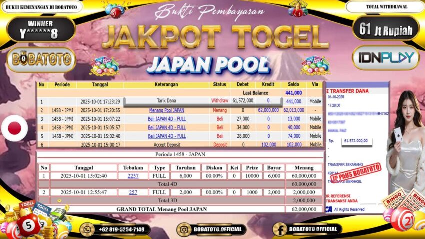 BOBATOTO – Selamat kepada User id : Y******8 Telah berhasil mendapatkan kemenangan besar pada permainan TOGEL JAPAN Dengan kemenangan Sebesar Rp.61,000,000,-. Setelah mengisi formulir withdraw dengan kurung waktu hanya 5 – 10 menit pihak bobatoto sudah melakukan transfer kepada pemilik Userid dan dana sudah dapat di cairkan oleh pemenang. Bukti pembayaran yang kami berikan merupakan bukti pembayaran yang SAH / VALID yang langung di dapatkan melaui tanda transfer transaksi dari Bank yang di tuju.