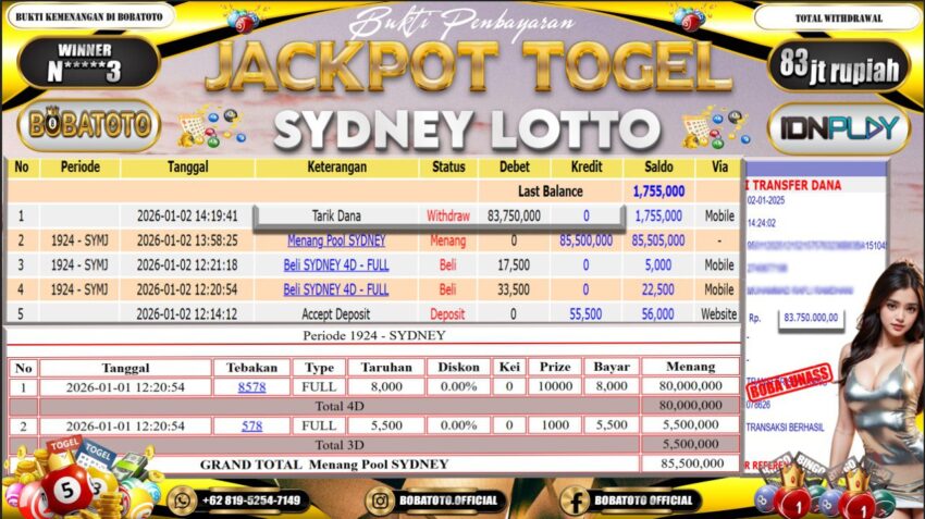 BOBATOTO – Selamat kepada User id : N*****3 Telah berhasil mendapatkan kemenangan besar pada permainan TOGEL SYDNEY LOTTO Dengan kemenangan Sebesar Rp.83,000,000,-. Setelah mengisi formulir withdraw dengan kurung waktu hanya 5 – 10 menit pihak bobatoto sudah melakukan transfer kepada pemilik Userid dan dana sudah dapat di cairkan oleh pemenang. Bukti pembayaran yang kami berikan merupakan bukti pembayaran yang SAH / VALID yang langung di dapatkan melaui tanda transfer transaksi dari Bank yang di tuju.
